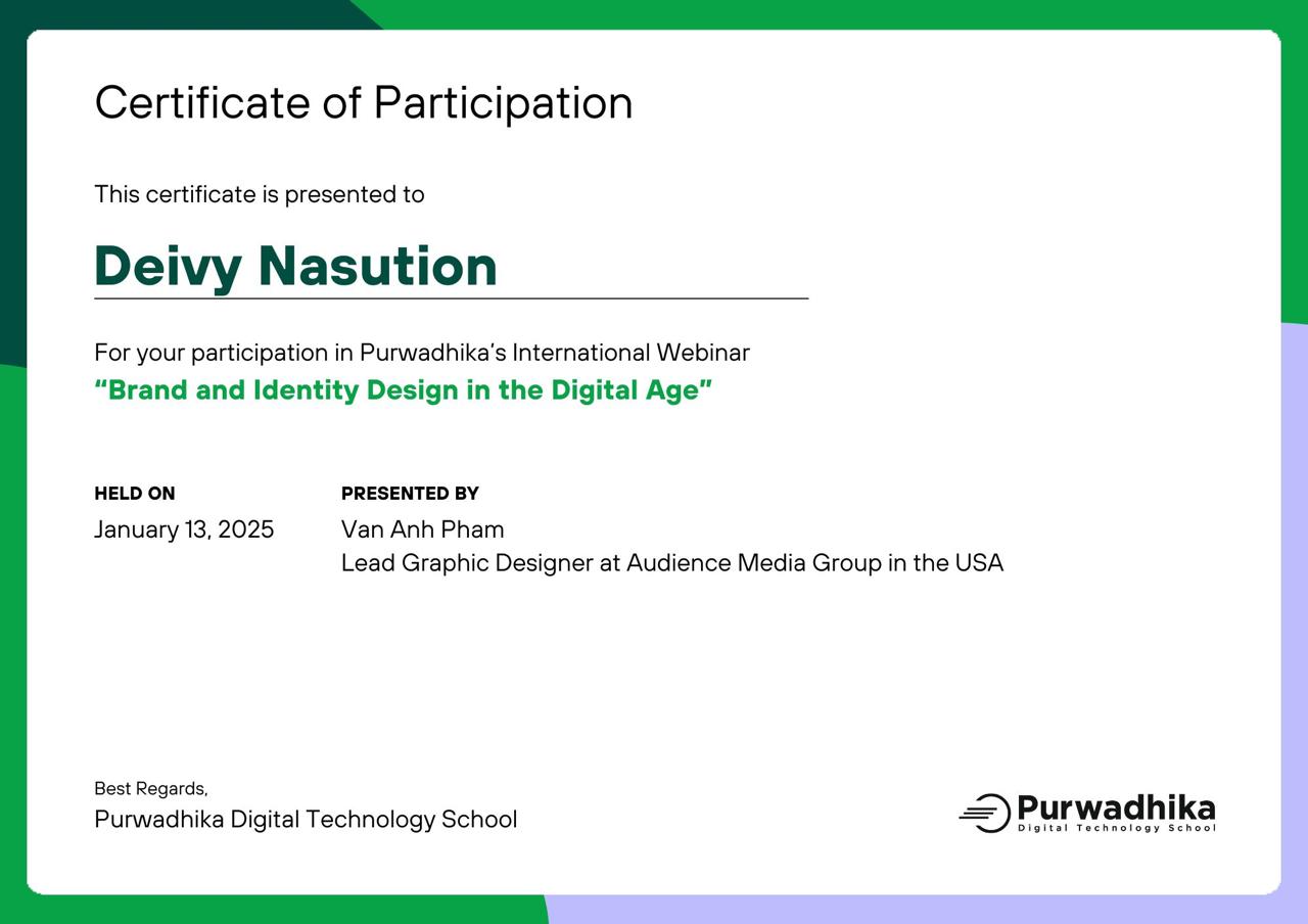 Nasution, Deivy Zulyanti Purwadhika's Internasional Webinar "Brand and Identity Design in The Digital Age". Purwadhika Digital Technology School.